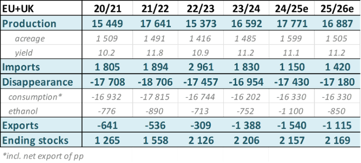European-wide, the 2024/25 campaign is slowly coming overall to an end. The Dutch campaign ended on 21st of January with a final sugar yield at 12.2mt/ha – 10% down year-on-year and an indication of lower overall production despite higher acreage. France and Germany will continue the campaign into February, while the UK will carry on into March. A completely different situation in South-East Europe with countries like Croatia, Hungary, Slovakia but also neighboring countries like Serbia suffering strongly under above mentioned diseases and drought conditions / heat waves. Although production estimates have gradually been revised down since the start of the campaign, total production is still estimated to be the highest since 2017/18. We maintain our production estimate for EU+UK at 17.8 million tons, with a downside risk. Due to the high production this campaign, good stocks and a high export number, it is expected that total acreage reduction in EU+UK for next season will reach 6-8%, which would mean a decrease in sugar production in the range of +/- one million tons, given average yields.