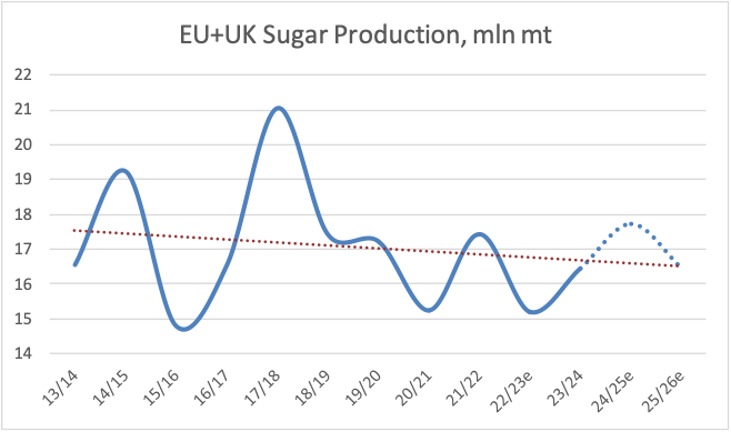 Sowing is now completed for the new season in all our countries. The period of drilling was quite okay. However, and according to the May MARS report, spring 2025 has been exceptionally dry in north-western Europe, with Benelux, northern France, Germany, western and southern Poland, and Sweden experiencing one of the driest springs on record. While cool nights and moderate daytime temperatures have helped limit crop stress so far, soil moisture levels are critically low, and rainfall is urgently needed to support yields. The warm, dry conditions have also favored the spread of yellow virus via aphids, particularly in France and the UK. As the important period for yields are still ahead of us, we keep our sugar yield numbers unchanged at the long-term averages for time being and with an estimated 8% decrease in acreage we end up with a production estimate at 16.6 million tons (EU/UK), down by 1.3 million tons year-on-year.