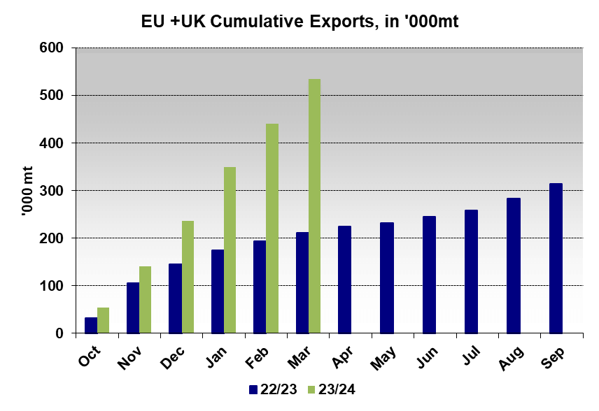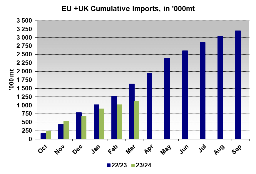Given the increase in production and a slightly weakish demand, export is set to increase to around 1.4 million tons in the next SMY 2024/25. Cumulative export from EU/UK to third countries in the first six months of this Sugar Marketing Year was 535 thousand tons and with the need to empty storage before the start of the new campaign it is reasonable to believe that sugar will be shipped at a slightly higher pace in the last six months of the marketing year. Monthly import flows have come down by 2/3 since October and if the current pace is maintained until September, total imports will fall short of our current estimate of 1.9 million tons. The expectation for 2024/25 is a further reduced total import of 1.7 million tons with a downside potential due to the lack of economic incentives. Ending stock as of March was reported at 10.1 million tons. Although some 1.2 million tons higher year-on-year, we can see a closing gap between the years, and we expect that a negative trade flow in the coming months will close the gap entirely.