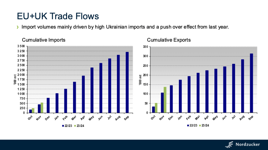 At the time of writing, protests by farmers across the EU are steadily increasing against the uncontrolled and distorting inflow of agricultural products from Ukraine. Consequently, the Commission has proposed now to renew the suspension of import duties and quotas on Ukrainian exports to the EU for another year, while reinforcing protection for sensitive EU agricultural products including sugar. An emergency brake is foreseen which would stabilize imports at the average import volumes in 2022 and 2023. This may translate to approximately 320 kto for 2024 and 145 kto for Jan-May 2025, both figures including the possibly revived TRQ of 20,070 tons as an addition in case the volume has been reached before end 2024, resp. before 5th June 2025. Given the imports in Oct-Jan, Ukrainian imports in SMY 23/24 could still reach 500kt.
