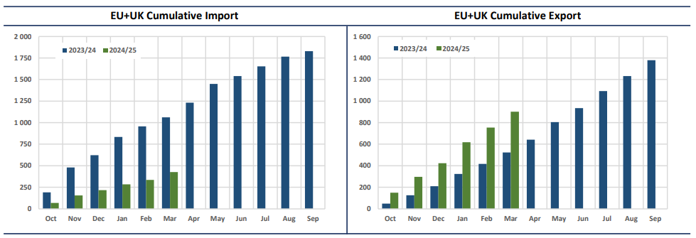On trade, significant changes are visible on the white sugar imports from neighboring countries. Balkan sugar is entering very slowly: only 17 kto of Serbian sugar in this marketing year (quota of 203 kto). With respects to imports from Ukraine, the EU Council has adopted the Commission’s Implementing Regulation granting Ukraine access to 7/12 of its annual sugar TRQ under the 2014 Association Agreement. This allows 11,708 mt of duty-free imports between 6 June and 31 December, in addition to the 109,439 mt already available under the ATM regime for the first half of 2025. As a recap, total imports from Ukraine have been 331,699 tonnes during 2024.