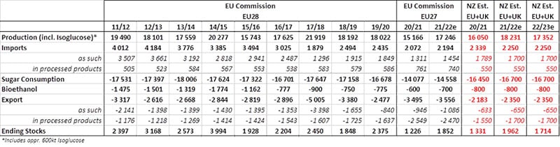 A takeaway out of the EU’s Management Committee for sugar 2nd June 2022 is the first estimation of the Beet areas 2022/23: down overall by 3.4% compared to current marketing year at 1.352 Mio ha. Main decreases in Poland (-25,400 ha) and France (-8,100 ha). COM will publish a first production estimate for 2022/23 soon. By applying the above-mentioned average yield approach to the estimated acreage, we may see a further drop of sugar production by some 500 kto in comparison to SMY 21/22. The EU sugar balance sheet has been adjusted, ending stocks described are somehow higher than in previous statistics but data quality still questionable.